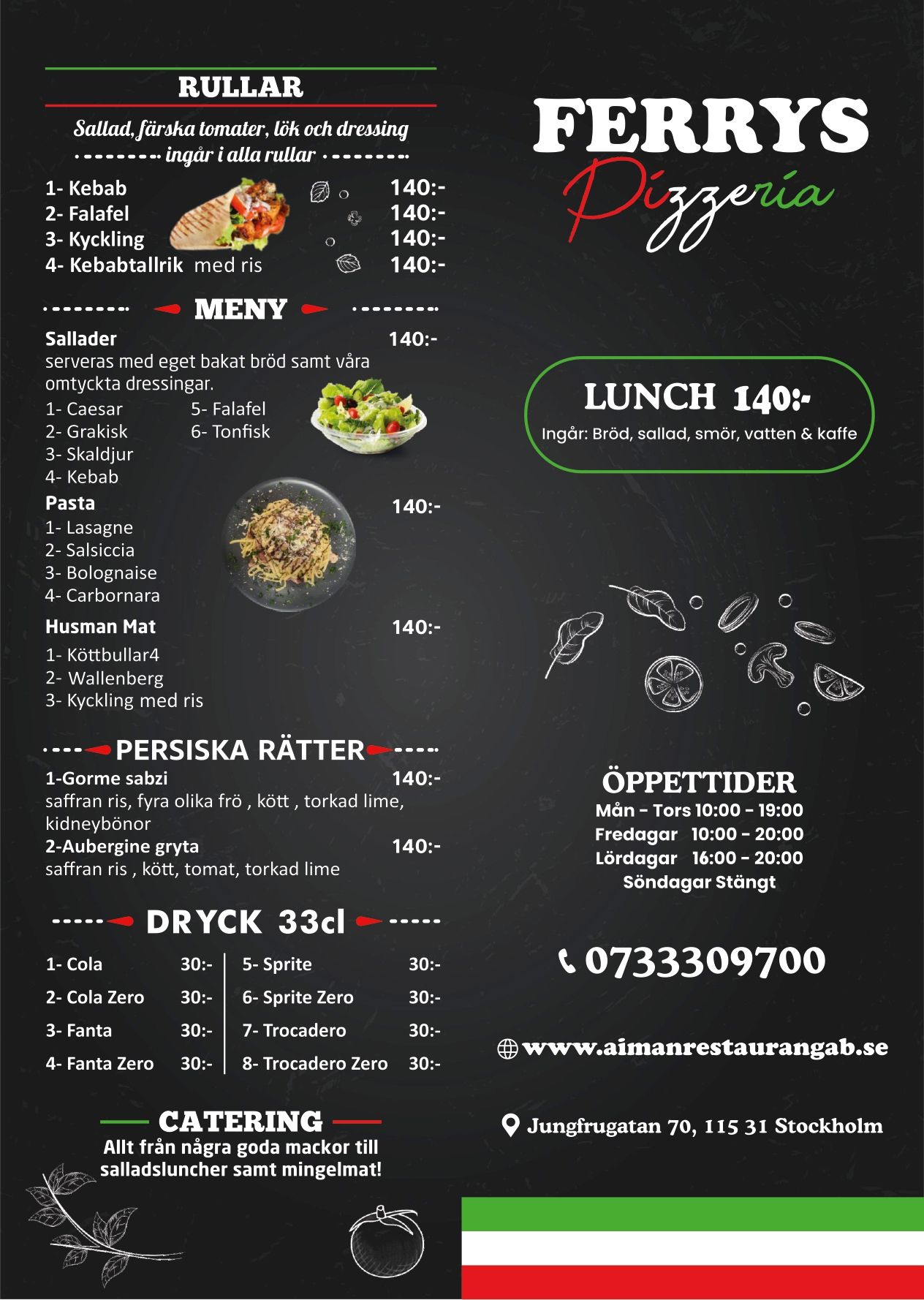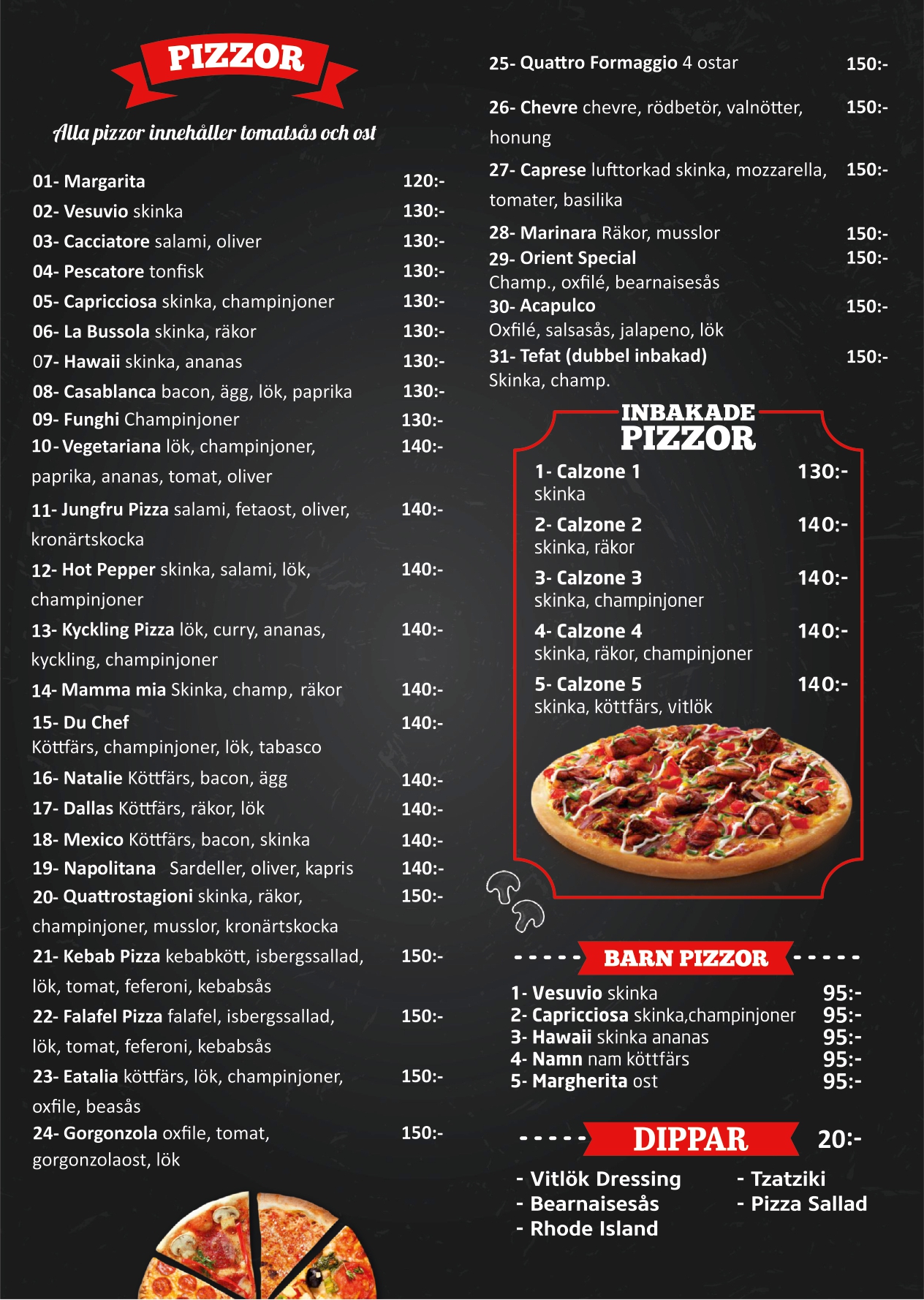 Vi erbjuder ett brett utbud av pizza, pasta, sallader och persiska rätter på vår meny.